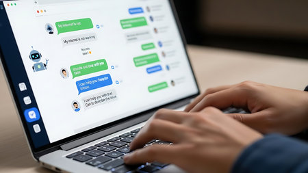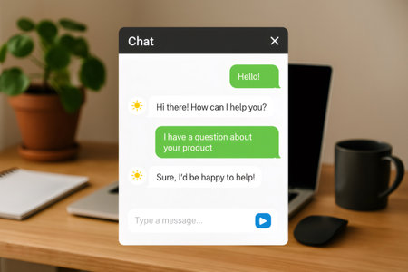 Customer service chat window delivering online support through a computer in a modern virtual office environment, enhancing communication and assistance