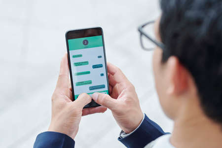 Smartphone of businessman using messenger application on his smartphone for communication with coworkers