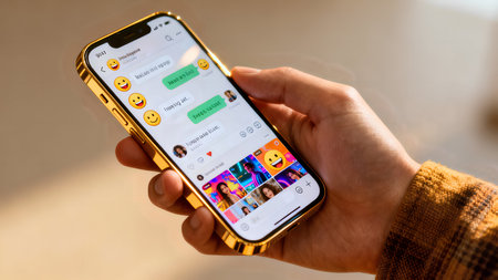 The image shows a hand holding a smartphone, which displays a screen filled with various emojis. The emojis include a mix of facial expressions, objects, and symbols. Below the emojis, there is a chat interface with profile pictures and names of contacts.