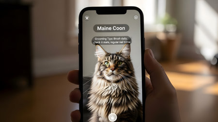 Smartphone shows a Maine Coon cat with grooming tips displayed using augmented reality. Clear det...