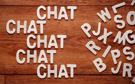 Chat.wooden elements spelling.Flat lay view from above on wooden elements buttons.IT technology concept.3D rendering on blue background.