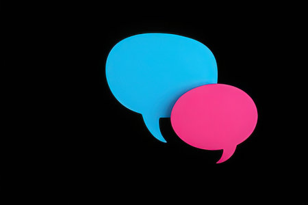 Four vibrant speech bubbles in pink, blue, yellow, and teal overlap against a stark black background, symbolizing conversation and dialogue.