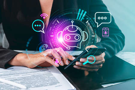 Businessman using chat bot in smartphone intelligence Ai.Chat bot with AI Artificial Intelligence, developed by OpenAI generate. Futuristic technology, robot in online system.