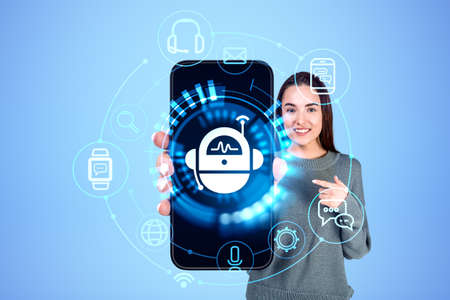 Smiling woman finger pointing at large phone screen, voice chat bot hud helpdesk on blue background. social media connection. concept of artificial intelligence