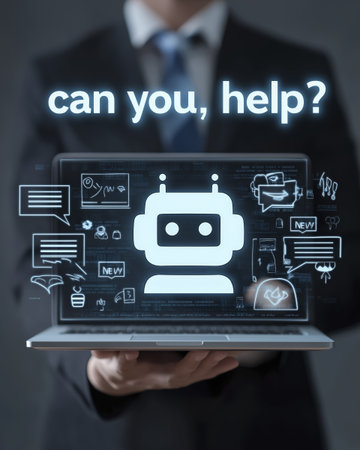 Person in suit holding laptop with digital robot icons and speech bubbles, asking for help with text can you, help displayed above