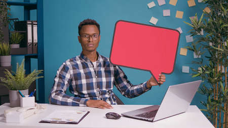 Young adult looking at camera and holding speech bubble for text message advertisement, showing blank card board. Person using carton paper box to create communication template.