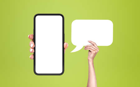 Woman hand show smartphone with mock up copy space screen. Holding a blank speech bubble on green background. concept of mobile app