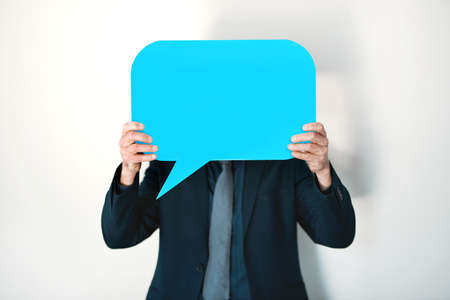 empty blue speech bubble in man hand. ideas and thoughts expression.