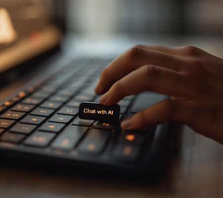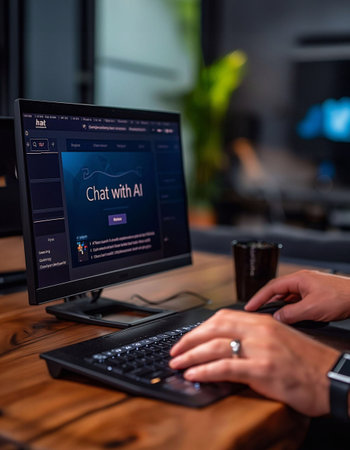 person sitting at a desk using a laptop computer, with the words Chat with AI on monitor, keyboard,