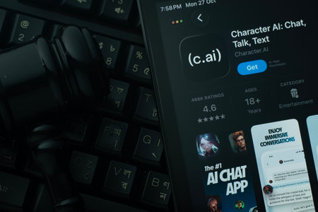 Dhaka, Bangladesh- 28 Oct 2025: An iPad displaying the Chatracter AI app against a judge's gavel and dark keyboard background.