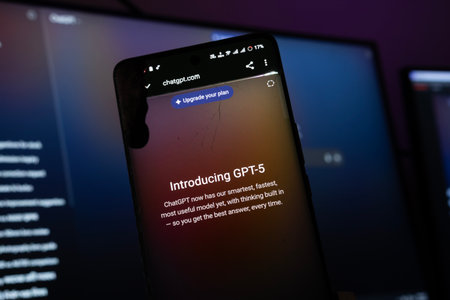 Dhaka, Bangladesh- 09 aug 2025: A smartphone screen displaying the OpenAI GPT-5 with the website is visible on a computer screen in the background.
