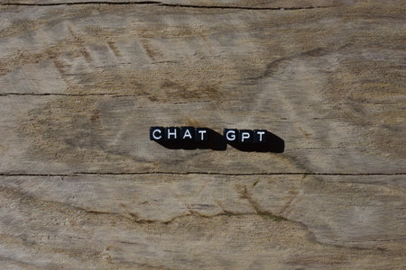 Black plastic beads spelling 'CHAT GPT' on a cracked wooden background. Concept of words with copy space.