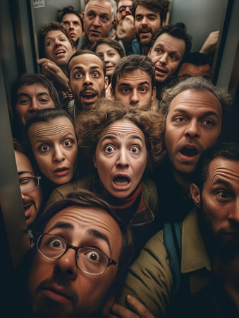 Drowning in people Top view of fearful young woman in formalwear feeling trapped by the crowd while standing in elevator : Generative AI