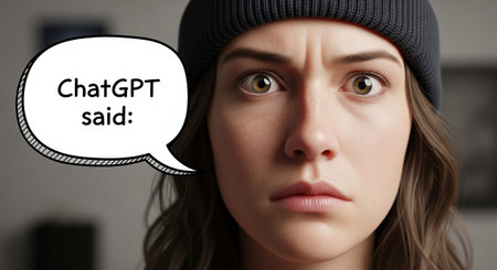 A close-up portrait of a young woman with a highly expressive, surprised, and perhaps worried facial expression. Her eyes are wide, and her brow is furrowed. She wears a dark beanie hat. A speech bubble containing the text ChatGPT said: is positioned next to her face, suggesting a reaction to something the AI has communicated. The captures a moment of intense human emotion in response to digital interaction.