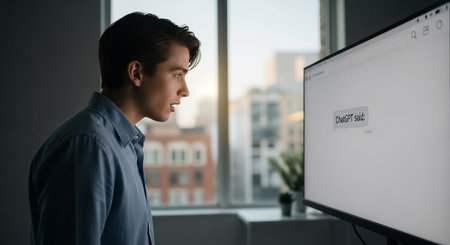 A young man, seen in profile, is intently focused on a computer monitor. His expression suggests curiosity and engagement as he looks at the screen, which text from ChatGPT. The setting appears to be a modern office or interior space with a large window in the background revealing an urban cityscape with buildings. The lighting is natural, coming from the window, and highlights the man's thoughtful gaze. captures a moment of human interaction with advanced AI technology, emphasizing the...