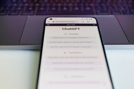 Galati, Romania - February 08, 2023: Webpage of ChatGPT, a prototype AI chatbot developed by OpenAI, on a smartphone screen. Examples of interactions with the AI are shown before a new chat.