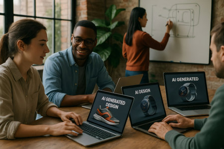 Design team collaborating on ai generated products, working on laptops in modern office, with a colleague sketching on whiteboard