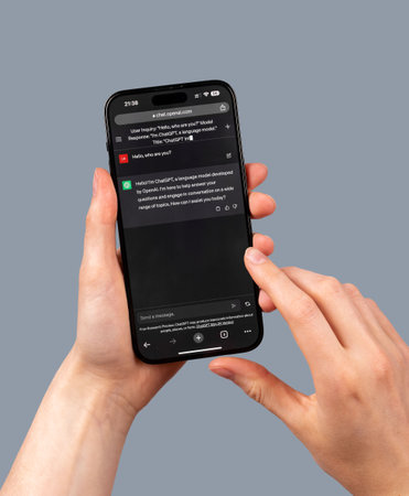Lodz, Poland May 14 2023 hand using AI, artificial intelligence on smartphone, smart Chat GPT app.