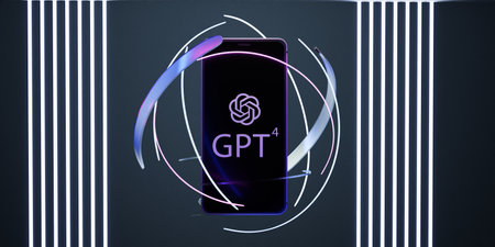 Minsk, Belarus, 30 March 2023: Phone with Chat GPT 4 of Open AI logo in futuristic style