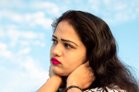 Close up photo shot of an Indian model with beautiful face with blurred background of sky with white clouds and looking away