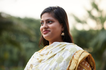 Portrait of smiling Indian woman in sari dress looking away