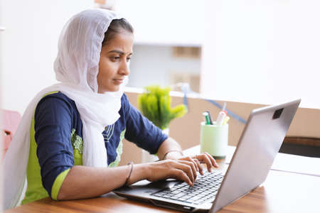Happy young indian girl using computer looking at screen working in internet - young girl busy working or reading on laptop at home - concept of online education, work from home or wfh