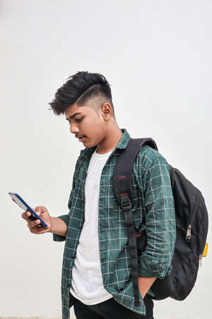 Indian college student using smartphone on white background.
