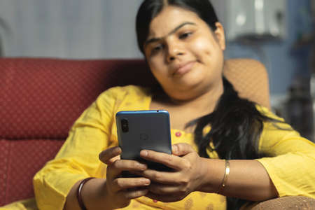 Selective focus of an Indian Asian pretty woman using smart phone sitting on sofa