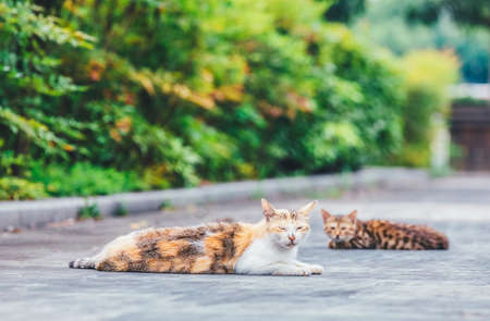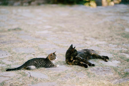 Two cats, gray with white and black and red, lie resting on the asphalt overgrown with grass.