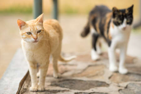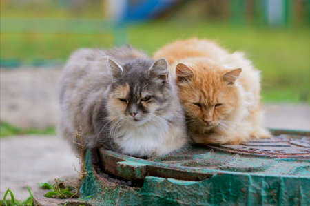 Ginger cat and tricolor cat in the summer yard. Beautiful pets portrait.