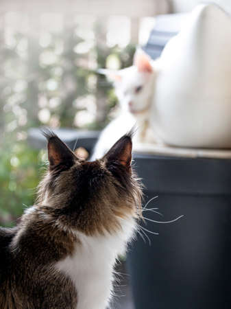 Handsome tabby with white Maine Coon cat looking to solid white cat friend that is laying outside.
