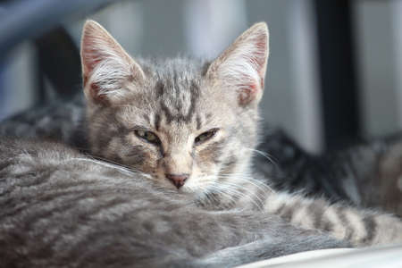 Photo of domestic cat (pet) in closed plan, with a fixed and cute look. Real animal in a real situation.
