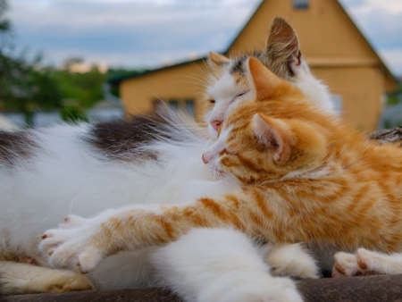 Fluffy multi-colored mom cat gently hugs a red kitten. A family of cats sleeps on a rooftop outdoors on a cloudy day. Parental love of animals.
