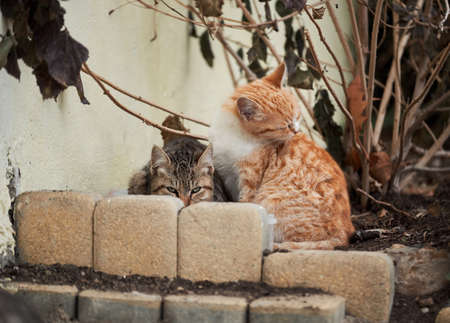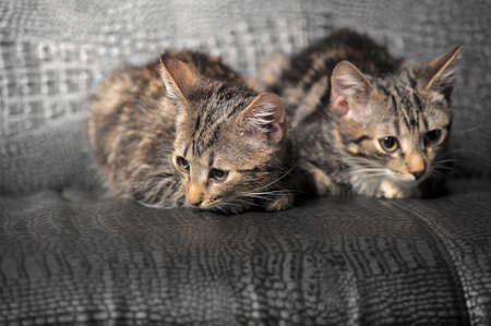 Two lonely gray and red striped kittens live on street together. Abandoned mongrel cats survive in harsh conditions in nature.