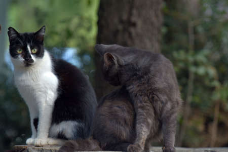 We see one tabby cat in profile and it looks somewhere to the side. He is in focus. The second cute beautiful tabby cat extends its torso, arching its back, as if it is doing yoga. Street party in the open air. Black and white composition. Most Israeli cats live on the streets to catch mice and rats. Without people, only animals. Funny emotional frame that evokes good emotions. Cats are soft and fluffy friends of people.