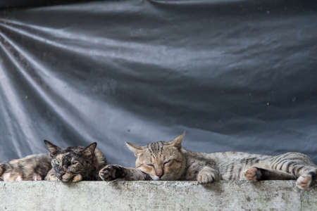 Friendship of domestic animals. Two lazy pets sleep. Fluffy pussycat and tabby cat close up.