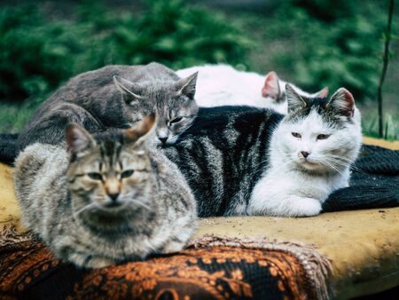 One tabby cat is looking directly into the frame in the center, the second tabby cat is looking down with sad sad eyes. The third tabby cat lies calmly and also looks away. Street party in the open air. Black and white composition. Most Israeli cats live on the streets to catch mice and rats. Without people, only animals. Funny emotional frame that evokes good emotions. Cats are soft and fluffy friends of people. Copy space.