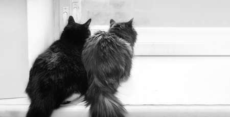 Two cute domestic pets - sitting cats looking up to window close up. Rear view. Black and white photo. Favorite pets. Copy space for text.