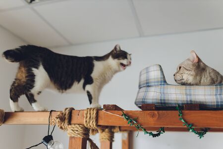 Portraif of the young cat hiding under the ceiling and watches what is happening