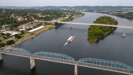 Chattanooga, TN - October 8, 2019: Aerial View of Chattanooga City Skyline alon g the Tennessee River