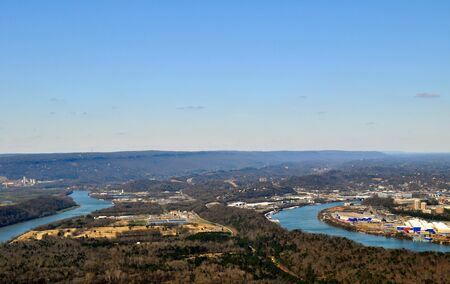 Aerial view of a bend in the Tennessee River flowing around beautiful Chatanooga TN