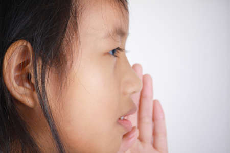 closeup portrait of beautiful little Asian girl whispering carefully with her hand covering her lips from side gesture trying to say secretly interesting information conversation news