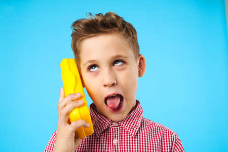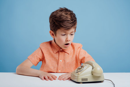 confused little boy with old telephone, sitting at the table, blue background