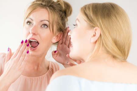 Young cute woman whispering secret on ear to her female friend. Communication and surprised girl by gossip.