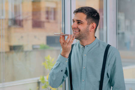 close up young asian man holding smartphone to talking by voice recognition application to communicate with friends or family for people lifestyle concept