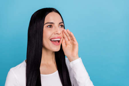 Close up side profile photo beautiful amazing she her lady yelling announce empty space chatterbox cant stop tell speak say person spread news wear casual white shirt isolated grey background