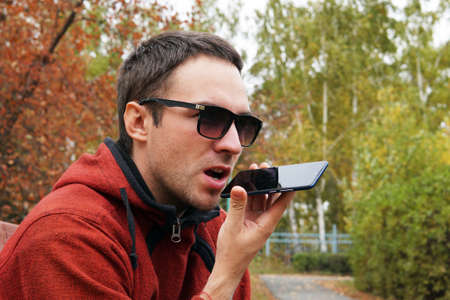 Recording on dictaphone. leisure, technology, communication and people concept - hipster man using voice command recorder or calling on smartphone at autumn park. dictate the thoughts in entry