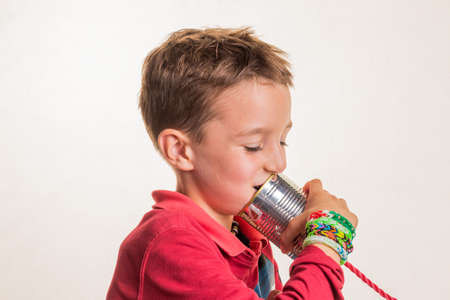child listens in a tin can phone.