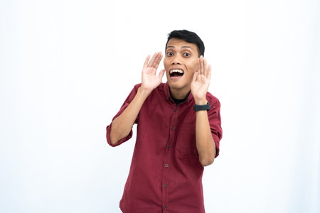Asian man, wearing red casual shirt, shouting with hand in mouth, isolated on white background.