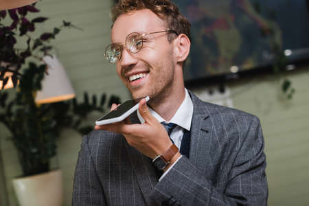 happy businessman in formal wear recording voice message on smartphone in cafe
